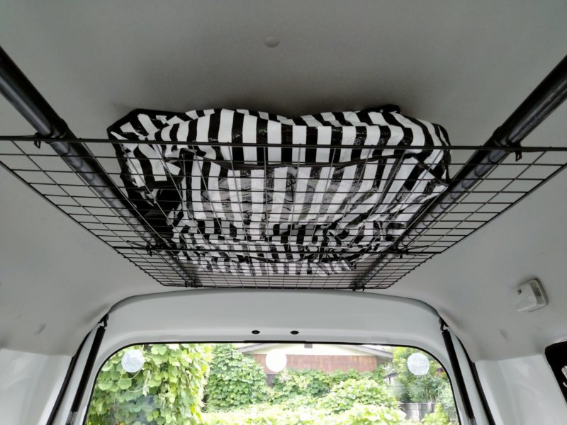 ダイソーで買った200円の網を2枚使って天井に収納スペースを作りました。